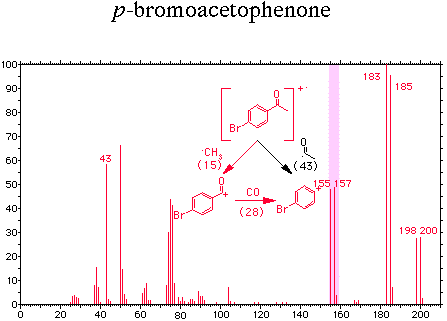 In the real application, clicking on the labeled peaks shows the most likely fragmentation pathway to cause the particular peak(s).